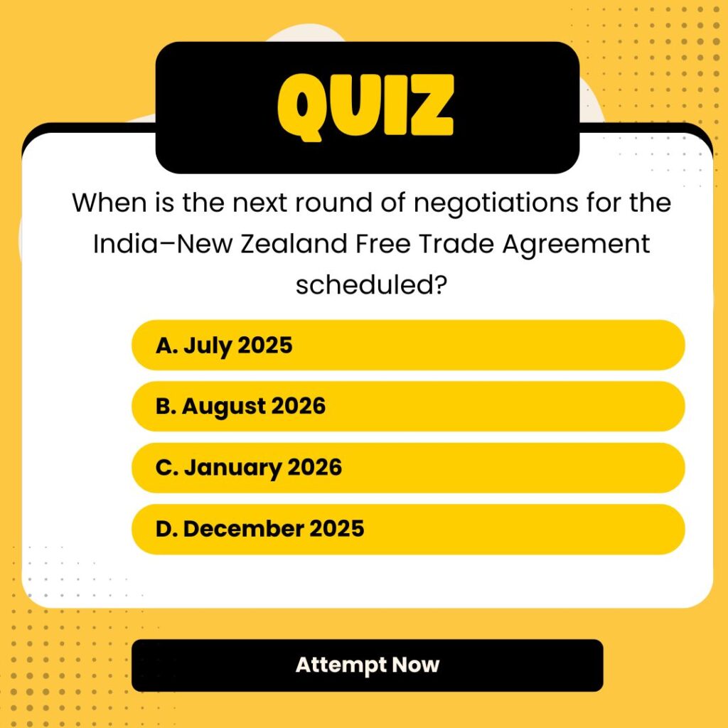 - The FTA was first launched in March 2025 during a meeting between Indian Commerce and Industry Minister Piyush Goyal and New Zealand’s Trade Minister Todd McClay.