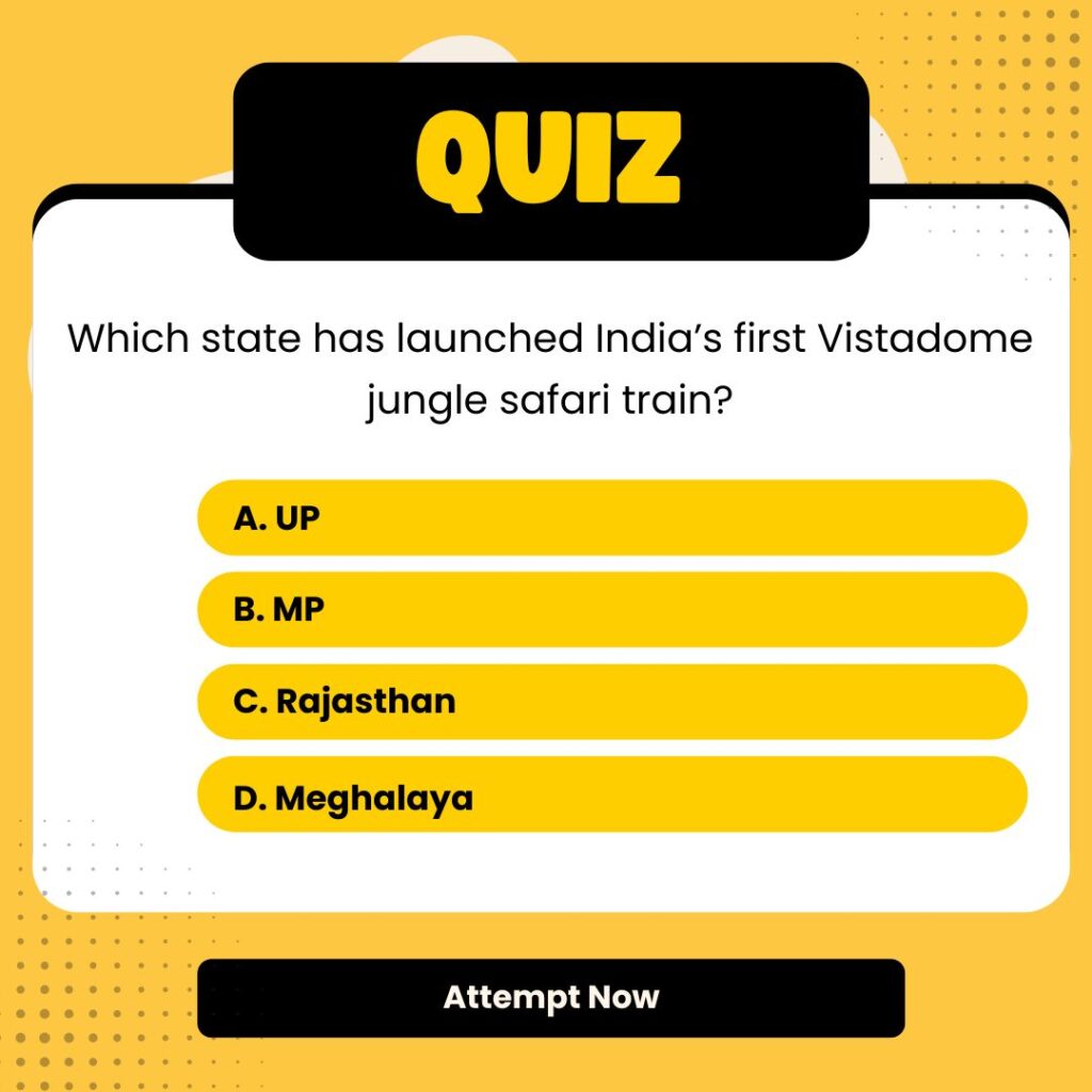 | Why in the news? | India’s First Vistadome Jungle Safari Train Launched in Uttar Pradesh |