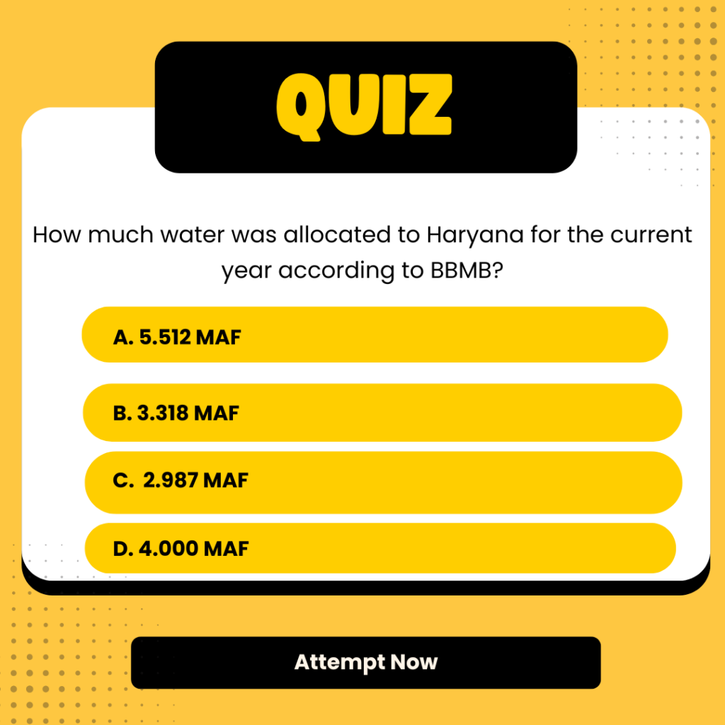 - Every year, BBMB sets how much water each state gets. For this year, Punjab was given 5.512 million acre-feet (MAF) of water, Haryana got 2.987 MAF, and Rajasthan received 3.318 MAF.