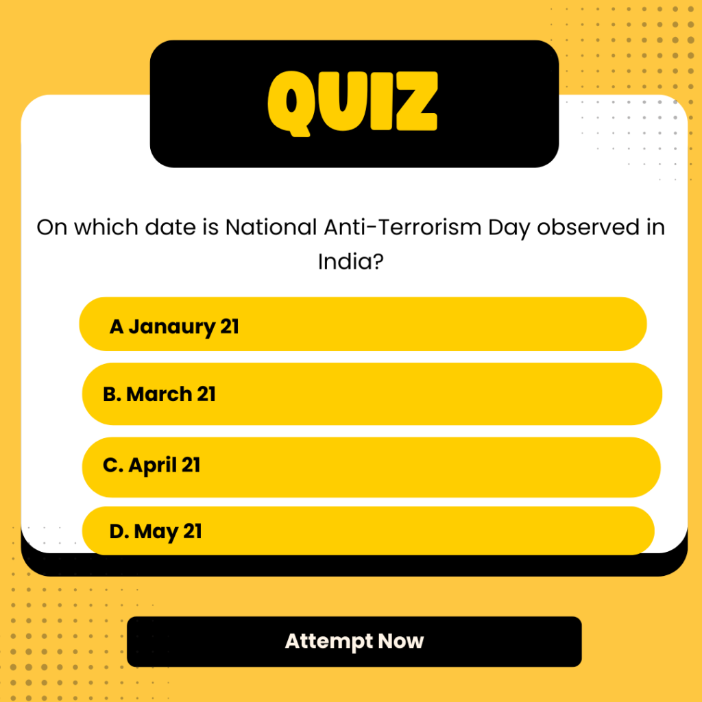 National Anti-Terrorism Day is observed every year in India on May 21. This day marks the death anniversary of former Prime Minister Rajiv Gandhi, who was assassinated in 1991 in Sriperumbudur, near Chennai. The day was started by the VP Singh government to remember him and raise awareness about the dangers of terrorism and violence.
