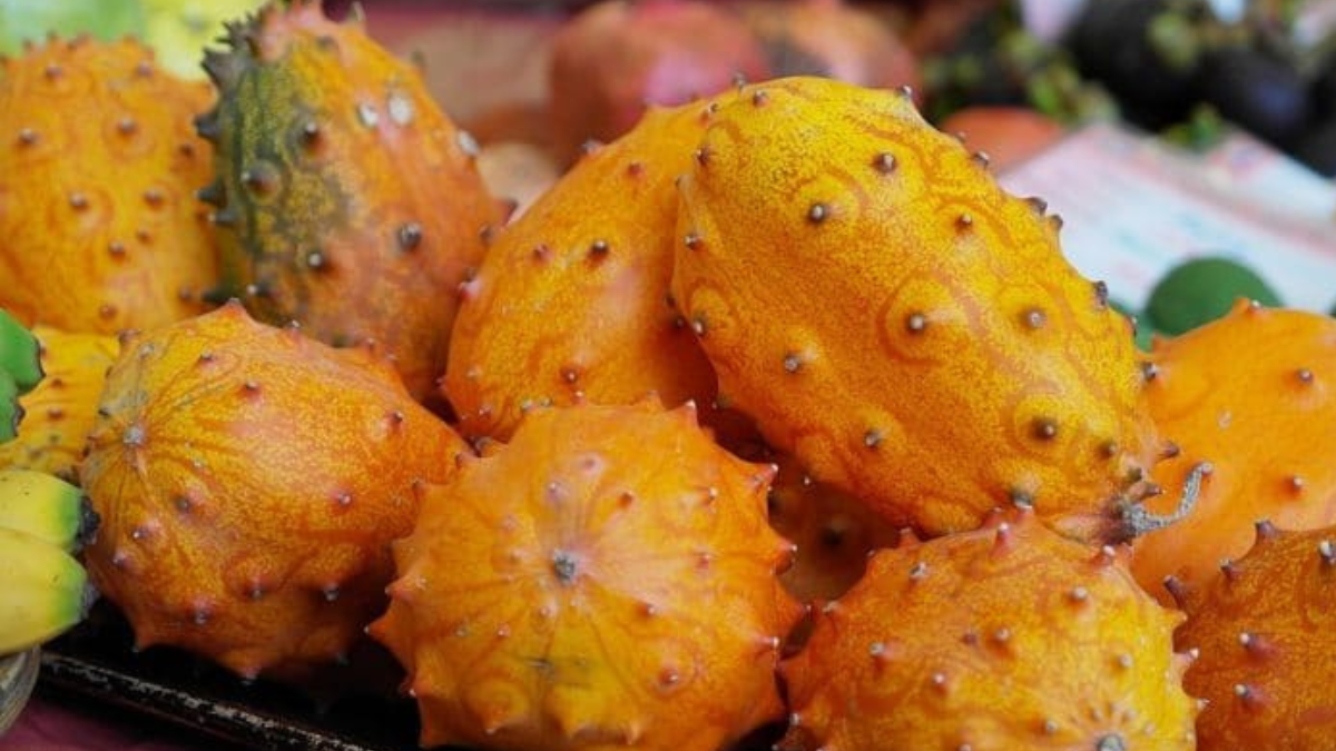 Horned Melon, also called Kiwano, has orange skin with small spikes. The inside is green and jelly-like. It tastes like a mix of cucumber, banana and lime. Its grows in Africa and is now also grown in New Zealand and the U.S.