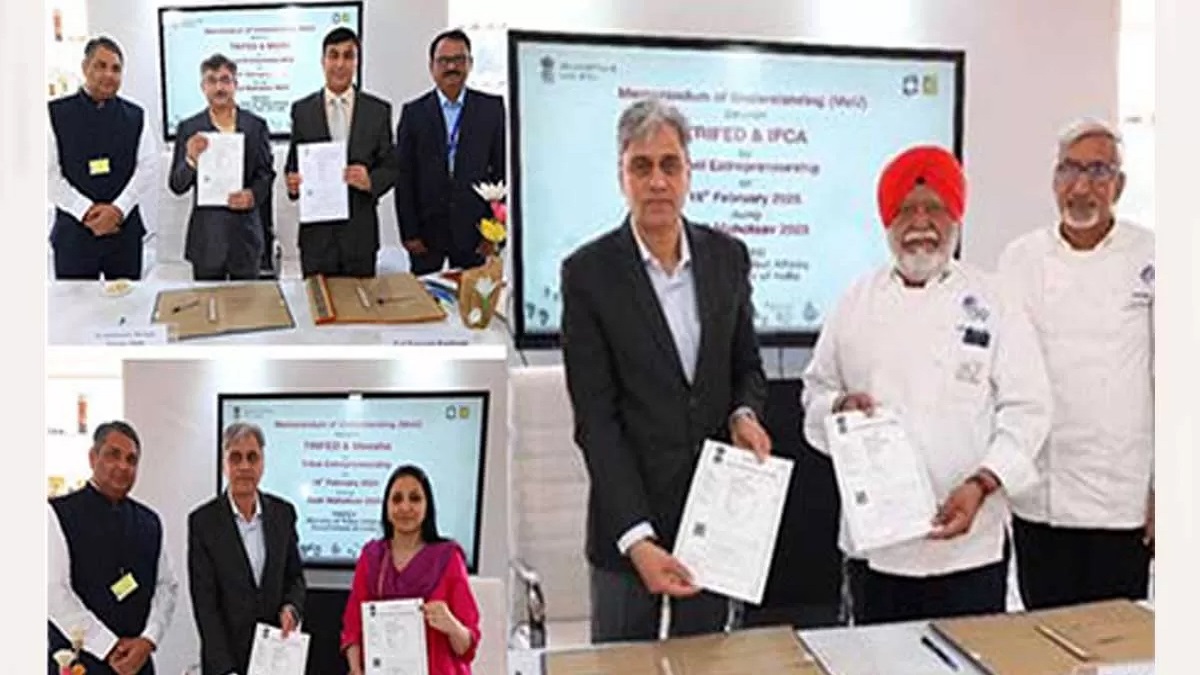 The Tribal Cooperative Marketing Development Federation of India Ltd (TRIFED), under the Ministry of Tribal Affairs, has signed key Memoranda of Understanding (MoUs) with the National Institute of Fashion Technology (NIFT) and the Himachal Pradesh Horticulture Produce Marketing and Processing Corporation Ltd (HPMC). These agreements, formalized during the Aadi Mahotsav event in New Delhi on February 24, 2025, aim to transition tribal marketing from a Business-to-Consumer (B2C) model to a broader Business-to-Business (B2B) model, significantly enhancing the market reach and opportunities for tribal artisans and producers.
