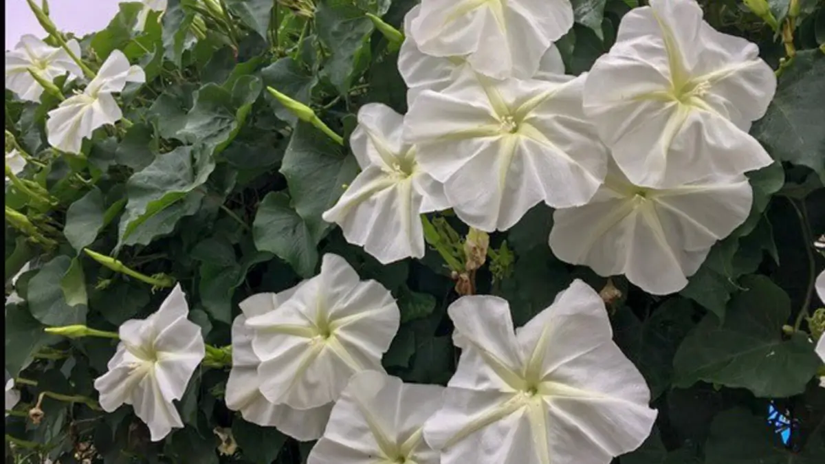 The Moonflower is a beautiful climbing vine scientifically known as Ipomoea alba. It grows in warm places around the world, especially in tropical and subtropical regions. The plant has big, heart-shaped green leaves and produces large white flowers that look like trumpets. These flowers smell sweet and can grow up to 6 inches wide.