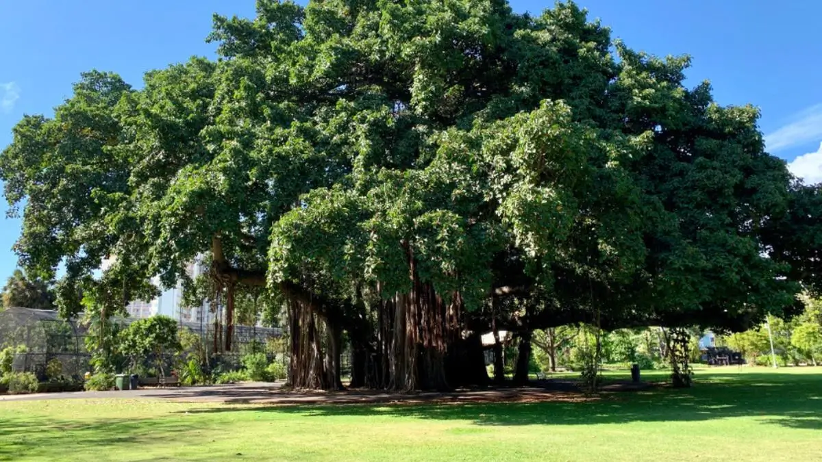 The scientific name of the Banyan tree is Ficus benghalensis. It belongs to the fig family. The most special feature of this tree is its aerial roots, which grow down from branches and become strong trunks over time.